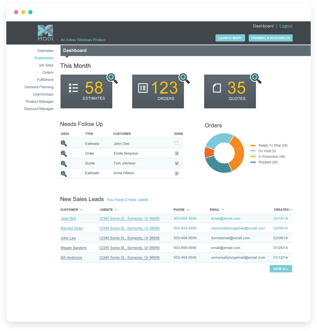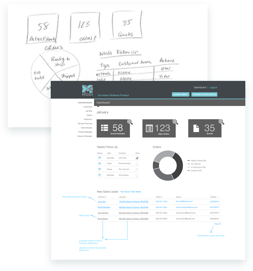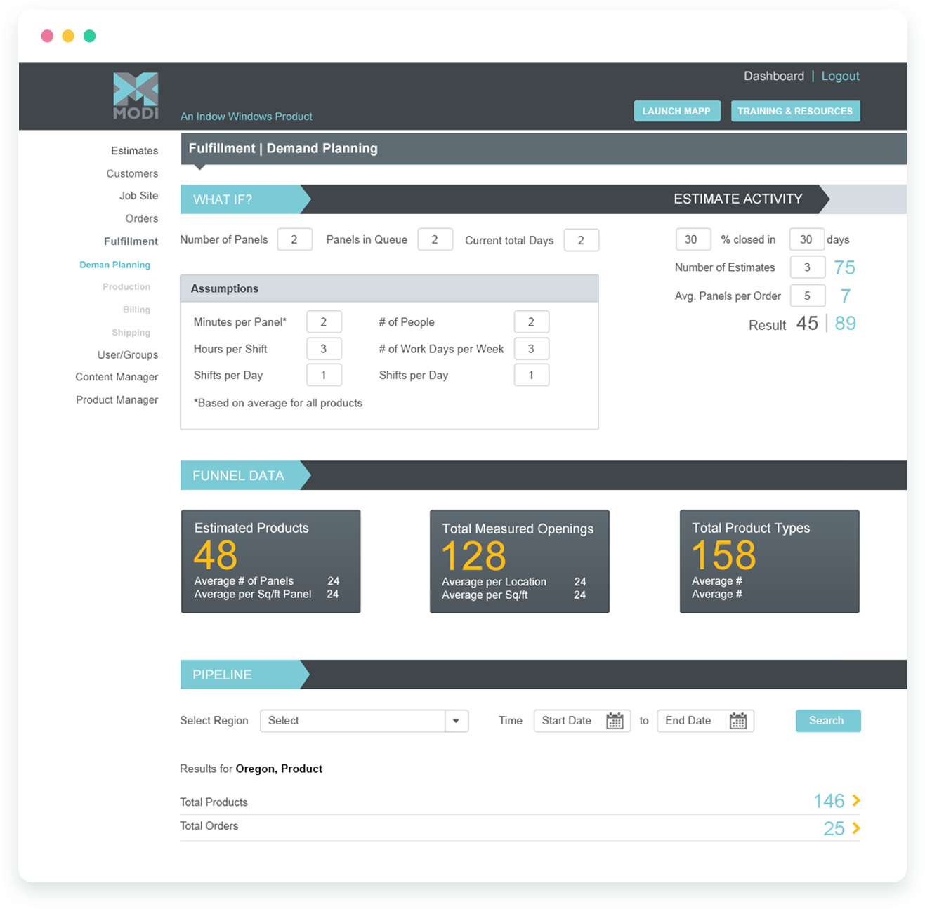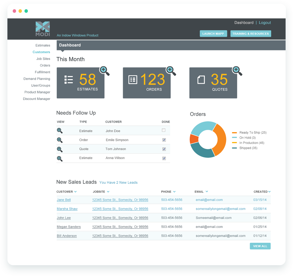 MODI is a web application system that manages inventory and orders for Indow Window staff and dealers. The existing structure was compartmentalized and clunky. New modules were added without streamlined connectivity. Items were hard-coded and difficult to change.