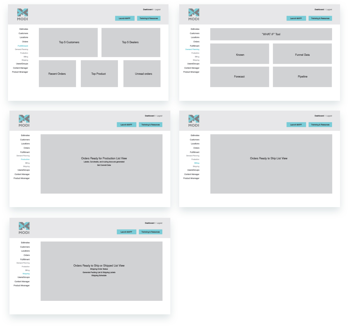 The MODI fulfillment flow was complicated but essential. First we identified the screens. I created a sitemap along with some basic wireframes to establish the fulfillment process.