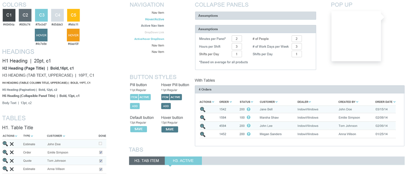 Indow Windows provided a branding style guide for MODI. Using the already defined styles, I created a MODI style guide of the key components for the development team to use as a reference.